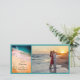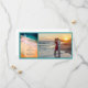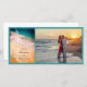 Anuncie a sua cerimônia de casamento de destino e a sua acolhida casual, mas elegante, com o bonito Casamento de Praia Tropical Salve o Cartão com fotos de Data. Este tema de trópicos personalizados do casamento mantém a data do anúncio mostra uma fotografia cênica da turquesa ou do oceano azul aqua em uma praia de areia branca com uma palmeira e um design de espiral teal adornando a esquina.
