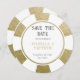 Deixe seus amigos e familiares saberem a data do seu casamento próximo. Este divertido cartão de salvar a data no design de uma ficha de pôquer será um grande sucesso com seus amigos e familiares. Adicione seus detalhes para um casamento de destino em Las Vegas ou em outro local com estilo de cassino. Em dourado falso e branco.
