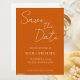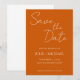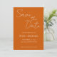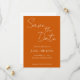 Convites de casamento estilo simples para salvar o dia que apresentam letra estilizada branca em um fundo de cor laranja queimada trendy. Edite e substitua nomes, data e local pelos seus. Selecione o tamanho do convite e o estilo do papel.