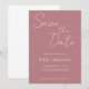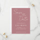 Convites de casamento de estilo simples para salvar a data, que apresentam letra estilizada branca em um fundo de cor rosa poeirento na moda. Edite e substitua nomes, data e local com os seus. Selecione o tamanho do convite e o estilo do papel.