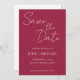 Convites de casamento de estilo simples para salvar a data que apresentam uma escrita estilizada branca em um fundo de cor vermelha vinho moderno. Edite e substitua nomes, data e local com os seus. Selecione o tamanho do convite e o estilo de papel.