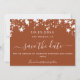 Um moderno e elegante Salve a Data para um casamento. Um fundo laranja queimado decorado com estrelas brancas. Personalize e adicione uma data e nomes. O texto: Salvar a Data é gravado com um script de estilo com letra de tendência grande.