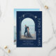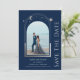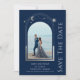 O Místico Blue Silver Sun Moon Stars Astronomy Space Astronomy Cosmic Galaxu Casamento Salve as Datas apresenta um sol prateado, lua e estrelas num fundo azul. Dentro é a sua foto favorita e o seu personalizado salva as informações de data. Adicione uma foto adicional no verso. Personalize editando o texto nas caixas de texto. Projetado por ©2022 Evco Studio www.zazzle.com/store/evcostudio