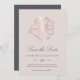 Avise os convidados do seu futuro destino, praia ou casamento na ilha tropical com estas belas cartões salve a data de verão com uma ilustração falsa de flor de hibisco de folha de rosa em um fundo rosa-rosa de pincel pastel mole. O roteiro de cinzas escuras e a inscrição em bloco exibem seus detalhes de casamento (nomes, data de casamento, local e site).