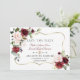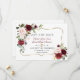 Desenho de cartão elegante com flores cor de rosa borgonha em aquarela e folhas verdes, uma moldura dourada falsa, divisor floral, em um fundo branco. No verso, os mesmos buquês de flores. Use a ferramenta Personalizar para adicionar suas informações, alterar as fontes e as cores das fontes. Para itens correspondentes, visite minha Coleção de Flores Rosa Borgonha.