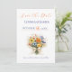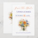 Cartão elegante de 'salve a data' com um delicado buquê de flores silvestres com acentos em azul empoeirado e tons neutros quentes. O layout limpo e minimalista destaca seus nomes e data de forma linda, perfeito para casamentos de jardim, ao ar livre ou românticos modernos.