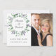 Cartões de aviso de casamento com dólar de prata e eucalipto em folha verde projetados para serem personalizados rápida e facilmente de acordo com os detalhes do seu evento.