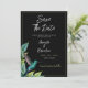 Um traçado de casamento impressionante, com um vívido beija-flor esmeralda encalhado entre as folhas tropicais, todas colocadas contra um fundo negro dramático com elegante texto verde e branco. Perfeito para celebrações exóticas, de destino ou ao ar livre.