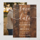 Este cartão de save-the-date de casamento boho de celeiro de madeira rústica e elegante pode ser personalizado com suas informações em tipografia chic e foto especial no verso. Projetado por Thisisnotme©