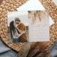 Um convite de casamento de outono romântico e moderno, com realismo fotográfico, apresentando um buquê floral seco neutro em tons de trigo, ocre e ferrugem. Clique para editar e personalizar este design com sua foto e detalhes.