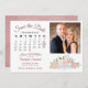Este belo casamento Salve o cartão de datilografia apresenta um design bócio rústico com um aglomerado de rosas de aquarelas pintadas manualmente, flores e folhas de eucalipto em tons de rosa poeirento, rosa-pincel, coral e mauve. O lado esquerdo do cartão é um calendário personalizável do seu mês de casamento com um coração à volta do seu dia especial. Há espaço para seus nomes, o local e uma nota curta. À direita há espaço para sua foto acima das flores. Elegante, na moda e chic, este cartão é uma forma excelente de deixar seus amigos e família saberem salvar a data do seu dia especial.