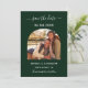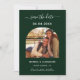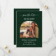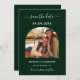 Um casamento moderno Salve o cartão com fotos de Data. Um fundo verde esmeraldo, texto branco. Personalize e adicione sua foto e detalhes do casamento.