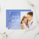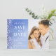 O Elegante Blue Glitter Photo Wedding Save The Date Invitation apresenta um script branco elegante em um fundo azul brilhante com sua foto favorita. Perfeito para casamentos, aniversário, aniversário, Bat Mitzvah, chás de fraldas, festas e comemorações. Projetado para você por © Evco Studio em www.zazzle.com/store/evcostudio