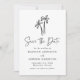 Ponha o tom para o seu casamento de destino com este chic salve o cartão de data, com palmeiras pretas desenhadas à mão sobre um fundo branco. Um script manuscrito exibe "Salvar a Data" em letras negras elegantes, com espaço abaixo para seus nomes, data do casamento e local. A parte de trás do cartão apresenta sua foto de noivado vertical e seu site de casamento para os convidados aprenderem mais — uma combinação perfeita de minimalismo moderno e encanto tropical.