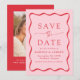 Anuncie seu próximo casamento em estilo com nossa foto do Modern Wavy Frame, salve as datas! O design apresenta seus nomes e detalhes de casamento enquadrados por um quadro vermelho ondulado em contraste com um fundo rosa. Na parte de trás do retrato, salve a data, a sua foto de noivado vertical com o seu site de casamento mostrado abaixo. Esta mistura requintada de design moderna e retrô garante que você salve a data não é apenas um lembrete de sua próxima celebração, mas um manto apreciado que captura a essência de sua história de amor.