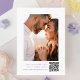 Compartilhe a entusiasmo do seu próximo casamento com esta elegante foto de lavanda, salve o cartão de data. A frente apresenta suas iniciais de monograma aninhadas dentro de uma delicada crista floral de lavanda, com "Salvar a Data" lindamente escrito em uma caligrafia de coordenação de lavanda sobre fundo branco. Adicione seus nomes, data de casamento e local para um toque personalizado. O verso mostra sua foto de noivado vertical junto com um conveniente código QR que os convidados podem digitalizar para visitar o site do seu casamento. Com espaço para instruções personalizadas, esta design é uma escolha encantadora para primavera, jardim ou comemorações românticas de casamento.