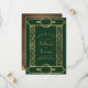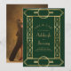 Este elegante casamento inspirado em vintage Salve o cartão de data com texto dourado em um fundo verde esmeralda escuro, enquadrado por uma borda geométrica de arte na moda vintage deco em folha de ouro falsa. Substitua a imagem de exemplo no verso por sua foto vertical favorita.