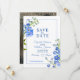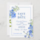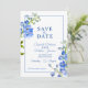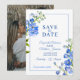Lindos picos delfinium pintaram arte botânica azul e foto no casamento inverso, salvo o convite para data. Edite esta opção para salvar o cartão de casamento de data com suas próprias palavras e fotos especiais. Design único e pintura manual original de uma fina cor d'água, de cor d'água, por Sarah Trett, exclusivamente para www.mylittleedenweddings.com no Zazzle.