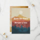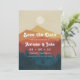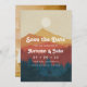 Um casamento de moda salve o anúncio da data para o próximo casamento da montanha ou floresta. Este design apresenta uma ilustração sutilmente angustiada de uma montanha e paisagem florestal em amarelo, laranja e marinho azul, sobreposta com os detalhes do seu casamento em branco retro. adicione a sua foto favorita no verso.