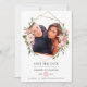 Cartões de aviso de casamento com fotos em floral watercolor rosa blush e rose gold com uma moldura geométrica dourada.