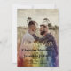 Este moderno LGBTQ que salva a data do convite para o casamento de gay apresenta uma fotografia do casal em segundo plano que você pode substituir por sua própria foto personalizada. Um gradiente do arco-íris estende-se da parte inferior. A opção Salvar a Data é impressa em uma fonte de script de folha de papel dourada. É perfeito e mágico para um casamento de gay ou lésbicas.