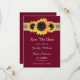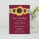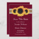 Cartão de aviso de casamento rústico borgonha e girassol com flores de girassol contra um fundo de renda e sarjapilota vintage adornado com luzes de corda. Dois corações de sarjapilota na parte de trás.
