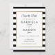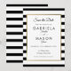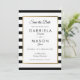 Com um clássico fundo de listras pretas e brancas, este elegante cartão de "save the date" apresenta uma sofisticada moldura em folha de ouro falso emoldurando os detalhes do seu "save the date" definidos em uma tipografia chic. Concebido por Thisisnotme©