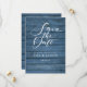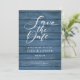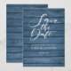 Este cartão de aviso de data de casamento rústico apresenta um aviso de data de casamento com grafia elegante acima dos seus detalhes definidos em tipografia elegante sobre um fundo de painéis de madeira azul rústico. Criado por Thisisnotme©