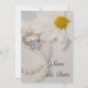 O bonito Casamento de Daisy Salve o Cartão de Anúncio de Data define um ambiente elegante para a próxima cerimônia de casamento. Este nupcial floral personalizado mantém o anúncio da data com uma fotografia floral de uma flor margarida branca, princesa quadrada cortada anel de noivado de diamante e colar de pérolas brancas.