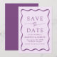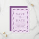 Anuncie seu próximo casamento em estilo com nosso casamento do Modern Wavy Frame, salve as datas! O design apresenta seus nomes e detalhes de casamento enquadrados por uma estrutura de onda roxa escura contrastando com um fundo roxo claro. Esta mistura requintada de design moderna e retrô garante que você salve a data não é apenas um lembrete de sua próxima celebração, mas um manto apreciado que captura a essência de sua história de amor.