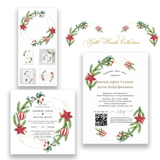Design elegante e único com galhos de pinheiro de cor d'água, bagas, bolas de Natal, arranjo de mãos douradas como uma coroa de férias de inverno sobre fundo branco. Use a ferramenta Personalizar para adicionar suas informações. Para mais ideias, visite minha Coleção de Feriados de Mãos Douradas.