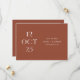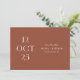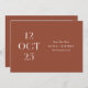 Anuncie a data do seu casamento com um estilo sazonal caloroso usando este cartão minimalista de Save the Date com um rico fundo terracota profundo (também conhecido como argila enferrujada). O layout de data editorial em negrito adiciona um toque moderno e de design avançado, enquanto o verso apresenta espaço para uma foto favorita para um toque pessoal. O tom terroso e quente torna este design perfeito para casamentos de outono, celebrações boho, eventos em vinhedos ou reuniões ao ar livre com texturas naturais e paletas de cores aconchegantes. Personalize a data, nomes, local e foto para se adequar ao seu estilo. Disponível como cartão impresso e download digital.