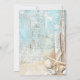 Um convite de casamento para a praia com madeira derivada, concha e areia. Cores azuis e beges. Personalize e adicione uma data e seus nomes. O texto: Salvar a Data é gravado com um script de estilo com letra de tendência grande.