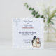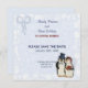 Adorável noiva e noivo pinguim românticos com trajes de casamento em um fundo damasco azul claro. Esses cartões de Salve a Data estão prontos para você personalizar com as informações do seu casamento.