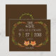 Esta encantadora coleção de convites de casamento apresenta um casal de raposas bem-vestidas cercadas por uma grinalda de folhas desenhadas à mão em uma disposição de coroa rústica.
