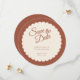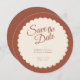 Elegante, porém moderno, e com um toque de retroglama, este cartão "Salve a data" de casamento apresenta um círculo em forma de escala, tons de terracota e beige e caligrafia elegante. Personalize esta design com suas próprias informações de casamento.