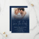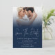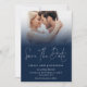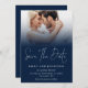 Casamento de Script Branco Azul com Sobreposição de Foto Moderna QR Code Marinho. Com um código QR no seu site de casamento, no verso para que seus convidados possam visitar facilmente seu site de casamento. Seu código QR será gerado automaticamente para atualizar o código de amostra no design, quando você simplesmente alterar o URL de amostra no modelo com o URL do seu próprio site de casamento. Salvar a data está em um script de conjunto de na moda. Substitua a foto de exemplo pelo seu favorito e personalize o resto do texto.
