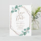 Este casamento botânico salve a data da placa lisa mostra um design moderno com as palavras "Salvar a Data" em um roteiro de cobre falso, com letras manuais, com os detalhes do seu casamento no centro para você personalizar bordado por um falso quadro de cobre geométrico acentuado pela pintura manual de cor d'água eucalipto verde. Os melhores votos para o seu casamento! Desenhada por Susan Coffey.