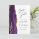 A borda esquerda deste elegante cartão de aviso de casamento moderno apresenta uma borda de ágata em azul roxo com pintura à água, aparada com brilho falso dourado. O texto personalizável combina fontes douradas manuscritas, copperplate e itálicas em um fundo de ameixa. O verso apresenta um design de ágata roxa e dourada correspondente.