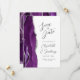 A borda esquerda deste elegante casamento moderno salve o cartão de data apresenta uma coloração d'água roxa com borda fina de prata. O texto personalizável combina a escrita manual de cinzas de carvão, as fontes em copperplate e itálico em um fundo branco. O verso apresenta um design de agata prateado e roxo correspondente.