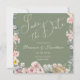 Esta Praça das Flores Selvagens Verdes Elegante, Sage Watercolor, Salve a Data é uma bela maneira de anunciar o seu dia especial. Apresentando um fundo verde macio enfeitado com flores silvestres delicadas em cor-de-rosa pincelado, azul poeirento, pêssego e tom de marfim, este design exude romance e sofisticação. Perfeito para casamentos botânicos, jardins, boho ou rústicos, ele dá o tom para uma celebração elegante. Personalize-o com os seus detalhes para criar a manutenção do eterno para os seus convidados.