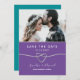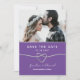 Celebre o seu amor com este design de salvamento simples e moderno. Apresentando um esquema mínimo de cor roxa e lacrimogênea, um coração romântico de corda prateada, e espaço para uma foto personalizada do casal, esta carta elegante é a maneira perfeita de anunciar seu dia especial!