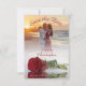 Estes cartões "Salve a data" são românticos, elegantes, elegantes e bonitos. Eles apresentam uma rosa vermelha longa e enrolada, refletindo em uma piscina de água com ondas e ondulações, sobrepostas na parte inferior da foto do quadro do cheio. O texto vermelho é uma caligrafia com script de rico que lê "salvar a data" com espaço para seus nomes, a data do casamento e a localização. A parte de trás apresenta um padrão vermelho ou arrojado. Maneira perfeita de deixar seus amigos e família saberem sobre seu próximo casamento.