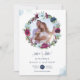 Um casamento de fotos elegante salve o cartão de data com manchas de aquarela azul delicadas e belas cordas florais moldando sua imagem. Elementos modernos de caligrafia escrita à mão, tanto na frente como no verso. Voltar com as mesmas manchas de aquarelas azuis da frente e delicados detalhes florais com nomes de casais (ou nomes juntos no topo e data no fundo). Flores em uma bela mistura de morango, burgundy, ameixa, framboesa, azul empoeirado e matizes marinhos. Parte da nossa coleção "Berry, Blue and Burgundy Floral".