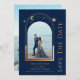Lavanda mística, cor-de-rosa, Sun Moon Star Space Casamento Salve as Datas apresenta um sol dourado, uma lua e estrelas em um fundo azul escuro e marinho. Dentro é a sua foto favorita e o seu personalizado salva as informações de data. Adicione uma foto adicional no verso. Personalize editando o texto nas caixas de texto. Projetado por ©2022 Evco Studio www.zazzle.com/store/evcostudio
