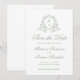 Anuncie seu grande dia em estilo com esta crista floral verde sábio guarde o cartão de data. Apresentando as iniciais do monograma do casal enquadradas por uma crista botânica macia, este design refinado destaca "Salvar a Data" em uma caligrafia verde graciosa sobre fundo branco. Adicione seus nomes, data de casamento e local para um toque pessoal que seja perfeito para temas de casamento inspirados na natureza, jardim ou eterno.