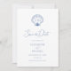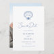 Este casamento de praia azul costeira salve o cartão de data tem uma casca de couro cabeludo com as iniciais do monograma da noiva e do noivo, e um modelo fotográfico no verso.