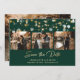 Cartões salve a data de fotos de casamento emerald green e gold personalizados elegantes com uma letra moderna. Nosso casamento salvou a data mostra uma coleção de fotos de 4 imagens contra um fundo verde esmeralda enfeitado com luzes de cordas. Personalize facilmente este esmeralda verde e ouro, salve o cartão de data com suas imagens e detalhes de casamento, incluindo um site de casamento, se desejar. Para pedidos personalizados, envie-nos uma mensagem.