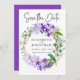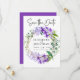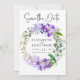 Anuncie o grande dia com este cartão de data moderno e único. Este design na moda apresenta uma coroa verde púrpura de flores geométricas com script e tipografia clássica. Personalize o cartão com seus nomes, data do casamento e quaisquer informações adicionais. Para mais personalização, entre em contato comigo em kbasandra@gmail.com.