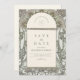 Um luxo salve o cartão de data com quadros florais complexos Art Nouveau em ouro mole contra um fundo verde profundo. Embelado com delicadas vinhas, flores e detalhes de safra, este cartão dá o tom para uma celebração de casamento romântica e eterno com estilo clássico e sofisticação.